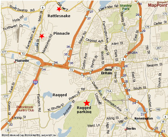 souther RI: Take RT 95 south to Old Saybrook and take exit 69 which puts you on RT 9 to Essex/Middletwon/Hartford. Take RT 9 to exit 28 (left exit) to New Britain. This puts you on RT 72/84. Take exit 2. At the light take a left on New Britain Ave. Take a right at next light on Cooke Street. This becomes RT 10. Follow this to RT 6 east. Go up ramp to RT 6. Within one mile you will see Pinnacle Road. Park there..